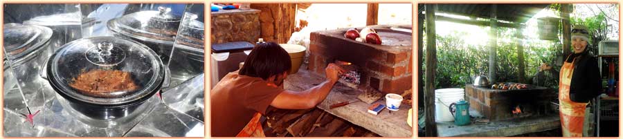Designed properly, stoves can use wood efficiently and sustainably. We have built three lorena stoves which are fired with pine, and are planning for a wood-fired oven to bake bread. Our lorena stoves are constructed out of brick and have a very small firebox which channels the smoke towards metal burners and then up and out a chimney, away from the kitchen.