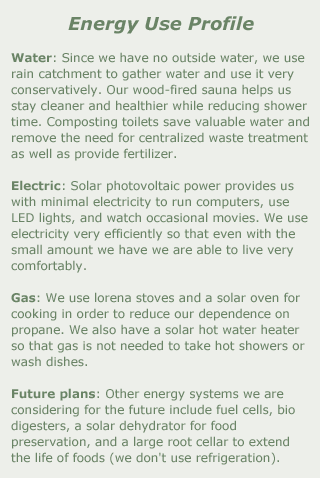 The primary dollar cost savings are from our conservation of electricity rather than the fact that our electricity comes from solar power. If we did rely on city power, our electric bill would be very small. We use an estimated 5% of the electrical power that a normal household uses.